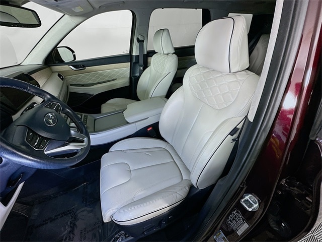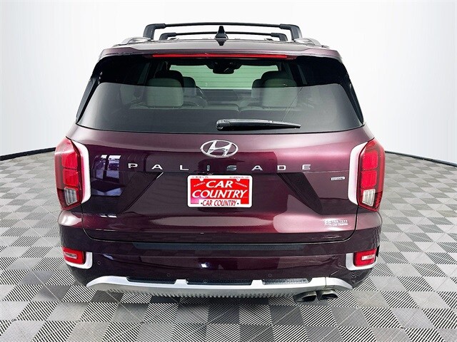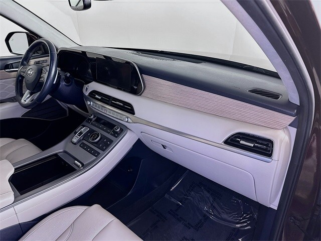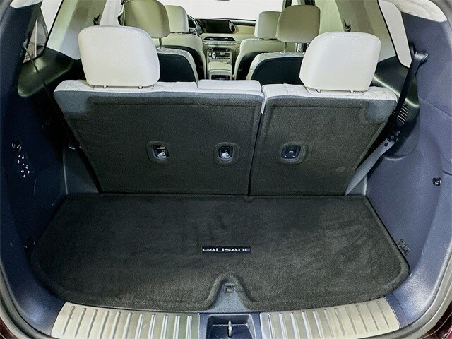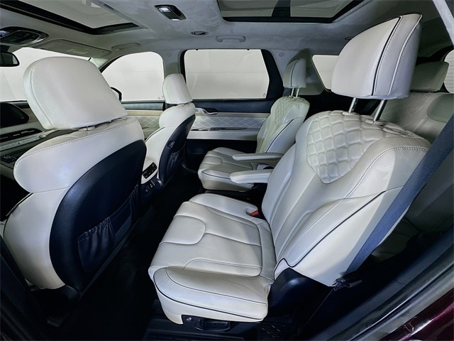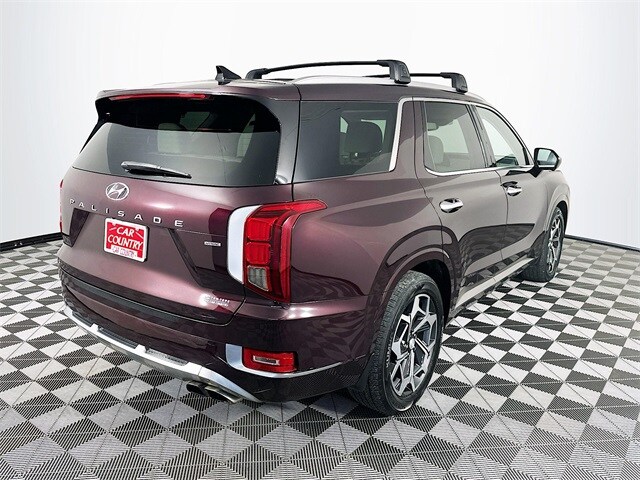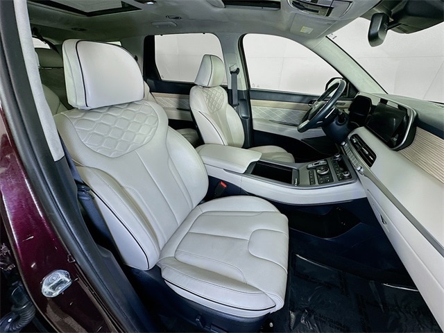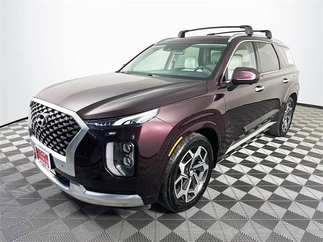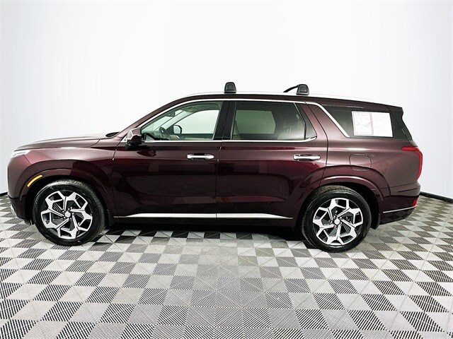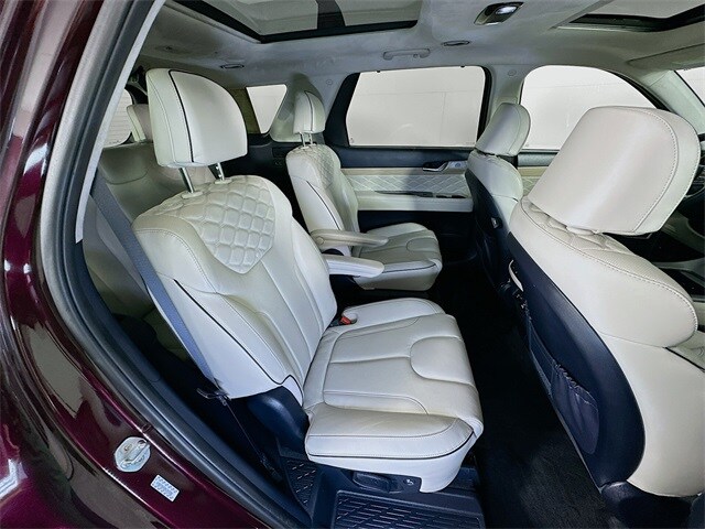 2022 Hyundai Palisade Calligraphy 8-Speed Automatic with SHIFTRONIC V6 Sierra Burgundy Carfax One-Owner, Palisade Calligraphy, V6, 8-Speed Automatic with SHIFTRONIC, AWD, Sierra Burgundy, Navy/Beige w/Premium Nappa Leather Seat Trim, 12 Speakers, 3rd row seats: split-bench, 4-Wheel Disc Brakes, ABS brakes, Apple CarPlay & Android Auto, Auto-dimming Rear-View mirror, Auto-leveling suspension, Automatic temperature control, Brake assist, Cargo Block, Cargo Net, Cargo Package, Cargo Tray, Dual front impact airbags, Dual front side impact airbags, Electronic Stability Control, Emergency communication system: Blue Link Connected Car Service (3-year complimentary subscription), Four wheel independent suspension, Front Bucket Seats, Front Center Armrest, Fully automatic headlights, Garage door transmitter: HomeLink, harman/kardon® Speakers, Heads-Up Display, Heated door mirrors, Heated front seats, Heated rear seats, Heated steering wheel, Knee airbag, Low tire pressure warning, Memory seat, Navigation System, Occupant sensing airbag, Outside temperature display, Overhead airbag, Overhead console, Power door mirrors, Power driver seat, Power Liftgate, Power moonroof, Power steering, Power windows, Premium Nappa Leather Seat Trim, Radio: AM/FM/MP3 Premium Audio System, Rain sensing wipers, Rear air conditioning, Rear window wiper, Remote keyless entry, Security system, Speed control, Speed-sensing steering, Steering wheel mounted audio controls, Tachometer, Telescoping steering wheel, Tilt steering wheel, Traction control, Turn signal indicator mirrors, Variably intermittent wipers, Ventilated front seats, Ventilated rear seats, Wheels: 20" x 7.5J Calligraphy Exclusive Alloy.
