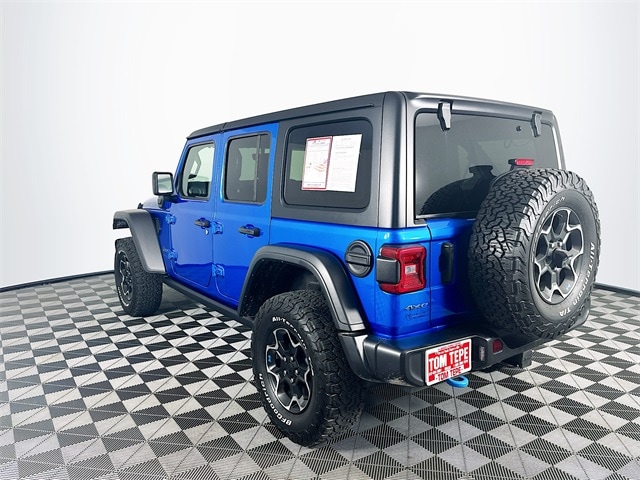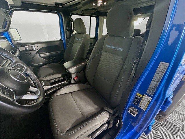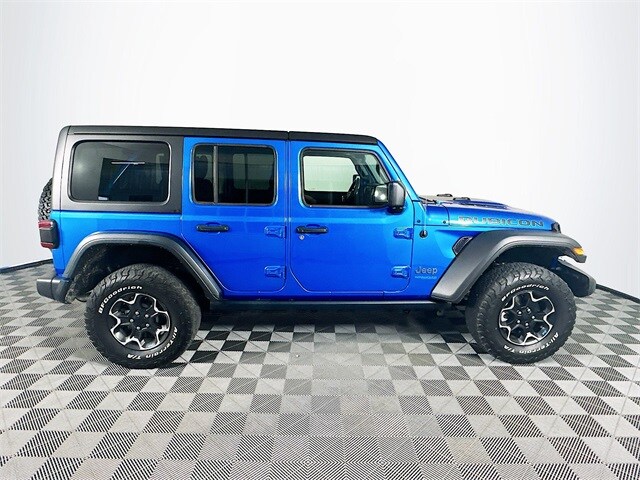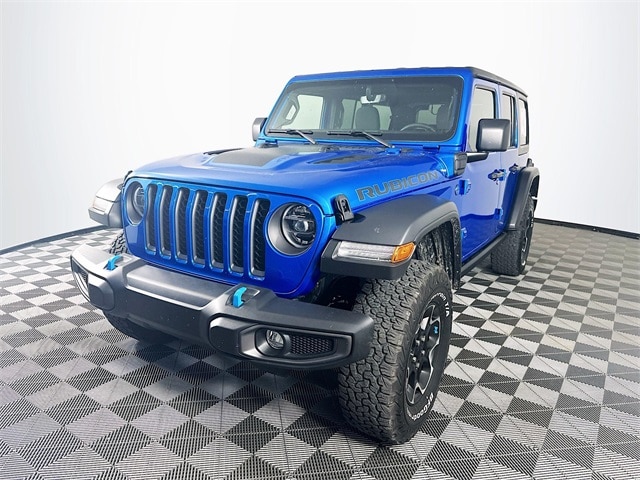 2022 Jeep Wrangler Unlimited Rubicon 4xe 8-Speed Automatic 2.0L I4 DOHC Hydro Blue Pearl Coat Odometer is 18176 miles below market average! Carfax One-Owner, Wrangler Unlimited Rubicon 4xe, 2.0L I4 DOHC, 8-Speed Automatic, 4WD, Hydro Blue Pearl Coat, Black w/Cloth Low-Back Bucket Seats, 4-Wheel Disc Brakes, 7 & 4 Pin Wiring Harness, 700 Amp Maintenance Free Battery, 9 Speakers, ABS brakes, Apple CarPlay/Android Auto, Auto-dimming Rear-View mirror, Automatic temperature control, Auxiliary Switches, Black 3-Piece Hard Top, Brake assist, Class II Receiver Hitch, Cold Weather Group, Dual front impact airbags, Dual front side impact airbags, Electronic Stability Control, Emergency communication system: SiriusXM Guardian, Freedom Panel Storage Bag, Front Bucket Seats, Front Center Armrest w/Storage, Front fog lights, Fully automatic headlights, Garage door transmitter, Heated door mirrors, Heated Front Seats, Heated Steering Wheel, Integrated roll-over protection, Leather steering wheel, Low tire pressure warning, Navigation System, Occupant sensing airbag, Outside temperature display, ParkView Rear Back-Up Camera, Performance Suspension, Power door mirrors, Power steering, Power windows, Radio: Uconnect 4C Nav w/8.4" Display, Rear Window Defroster, Rear Window Wiper/Washer, Remote keyless entry, Remote Start System, Security system, Speed control, Steering wheel mounted audio controls, Tachometer, Telescoping steering wheel, Tilt steering wheel, Traction control, Trailer Tow & HD Electrical Group, Trip computer, Variably intermittent wipers, Wheels: 17" x 7.5" Machined/Painted Black.