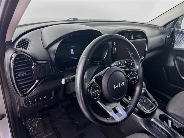 2023 Kia Soul EX CVT 2.0L I4 DOHC Steel Gray Carfax One-Owner, Soul EX, 2.0L I4 DOHC, Steel Gray, Black/Gray w/Woven & Tricot Cloth Seat Trim, 17" Alloy Wheels, 4-Wheel Disc Brakes, 6 Speakers, ABS brakes, Apple CarPlay & Android Auto, Auto High-beam Headlights, Automatic temperature control, Brake assist, Dual front impact airbags, Dual front side impact airbags, Electronic Stability Control, Emergency communication system, Exterior Parking Camera Rear, Front Center Armrest, Front wheel independent suspension, Fully automatic headlights, Heated door mirrors, Heated Front Bucket Seats, Leather Shift Knob, Leather steering wheel, Low tire pressure warning, Navigation System, Occupant sensing airbag, Outside temperature display, Overhead airbag, Overhead console, Panic alarm, Power door mirrors, Power driver seat, Power moonroof, Power steering, Power windows, Radio: AM/FM/MP3/HD Audio System, Rear window wiper, Remote keyless entry, Speed control, Speed-sensing steering, Steering wheel mounted audio controls, Tachometer, Telescoping steering wheel, Tilt steering wheel, Traction control, Variably intermittent wipers.
